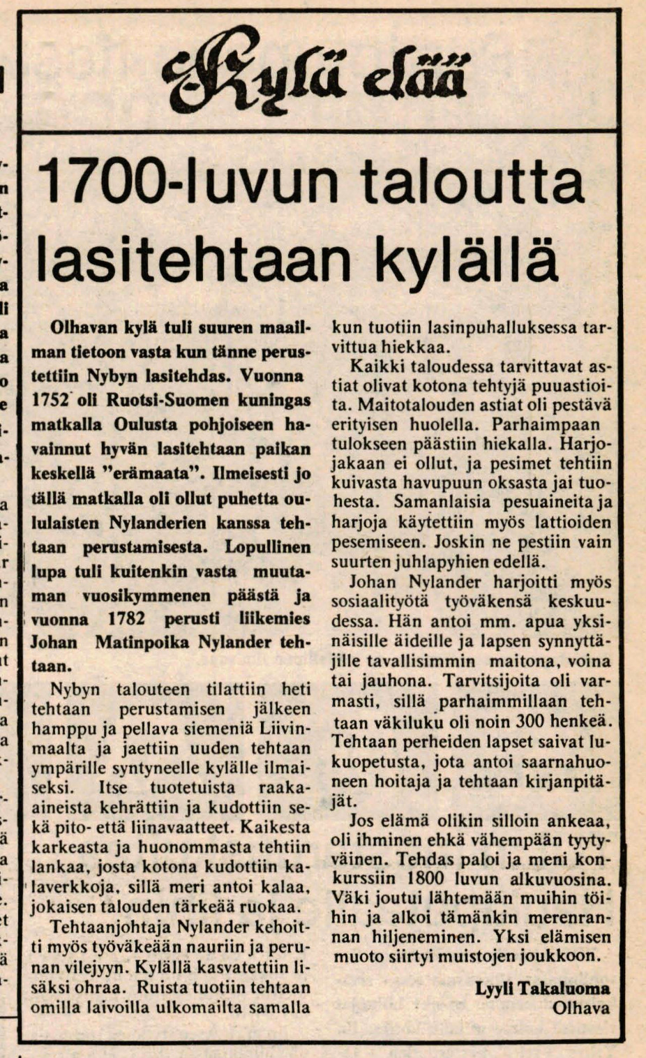 - Mielenkiintoinen Kylä elää ‑sarja jatkui Rantapohjassa 28.2.1980. Lyyli Takaluoma Olhavasta kirjoitti Nybyn lasitehtaasta Olhavassa. Vuonna 1752 Ruotsi-Suomen kuningas Aadolf Fredrik oli matkalla Oulusta pohjoiseen havainnut hyvän lasitehtaan paikan “keskellä erämaata”. Lopulta lasitehdas perustettiin vasta vuonna 1782 liikemies Johan Matinpoika Nylanderin toimesta. Kuningas Aadolf Fredrik teki vuonna 1752 laajan “maakuntamatkan” Suomeen. Hän tarkasti Suomenlinnan rakennusvaiheen ja vieraili myös Oulussa. Edellisestä kuninkaan vierailusta Suomeen olikin yli 120 vuotta. Niin se aika kuluu.