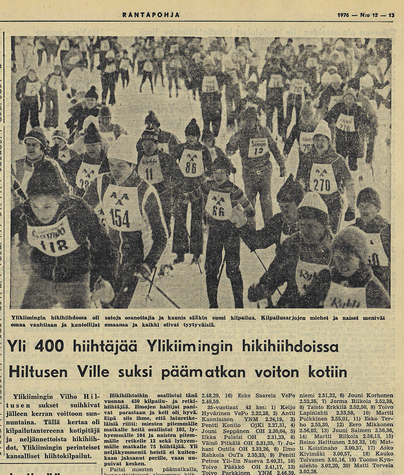 - Ylikiimingin hikihiihdossa 430 osallistujaa. Määrää pidettäisiin nykypäivänä hämmästyttävän suurena, kun puhutaan pienen pitäjän hiihtotapahtumasta. Hiihtoinnostusta riitti tuolloin kevättalvella 1976. Sää ja kelikin suosivat. Tänä vuonna tapahtumaa ei voitu järjestää. Lumet sulivat liian aikaisin. Uutinen Rantapohjassa 8.3.1976.