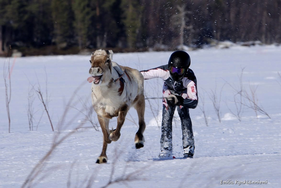 - Yli-iiläinen, Kollajan paliskunnan porokuningas Ennin Eka ja ajajansa Lenni Kynkäänniemi. Kuva: Emilia Kynkäänniemi