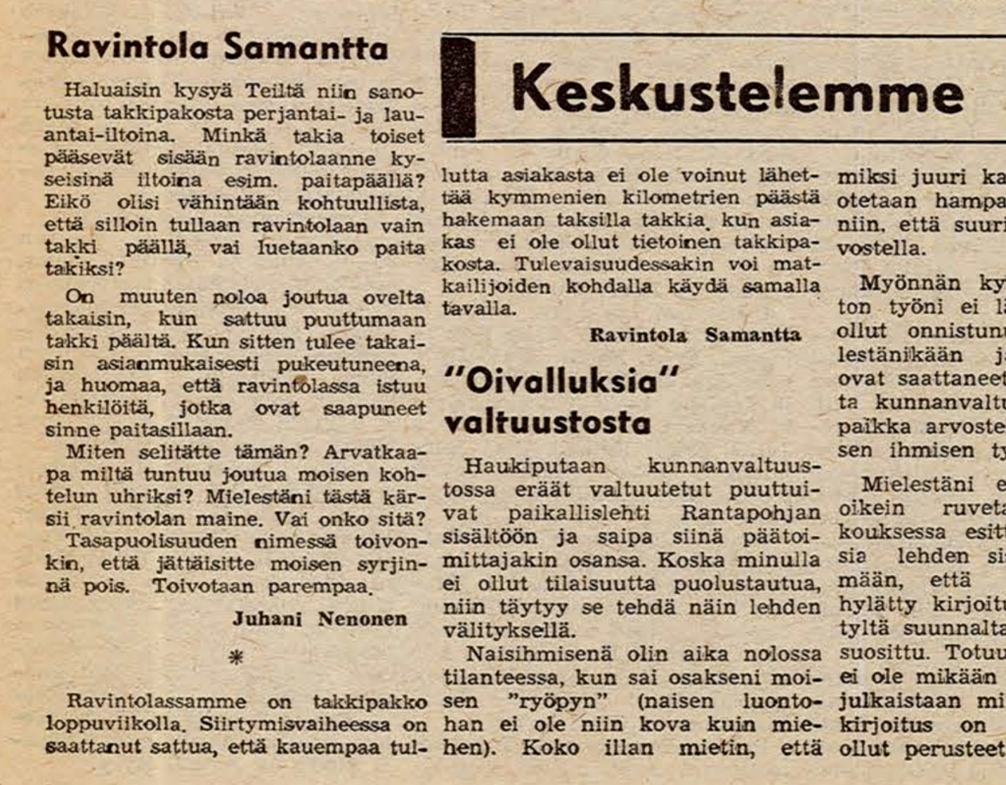 - 1970-luvulla ei ravintolaan menty ihan noin vain, vaan vaatimuksena miehille saattoi olla esimerkiksi solmio ja muutenkin siisti asu. Ravintola Samanttassa näytti olleen vuonna 1973 miehille pikkutakkipakko, jonka soveltamisesta Samanttalle esitettiin tiukka kysymys Rantapohjassa 25.1.1973. Samantta vastasi.