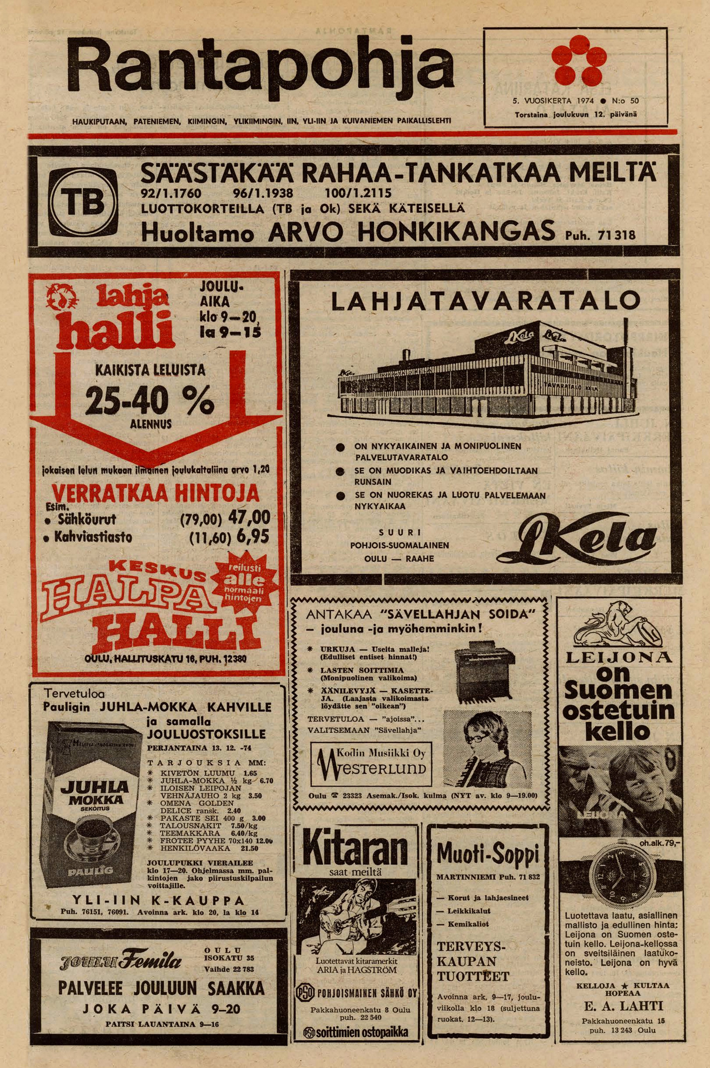 - Joulun lähestyminen näkyi Rantapohjan etusivulla 12.12.1974. Ilmoittajaksi olivat innostuneet myös oululaiset toimijat.