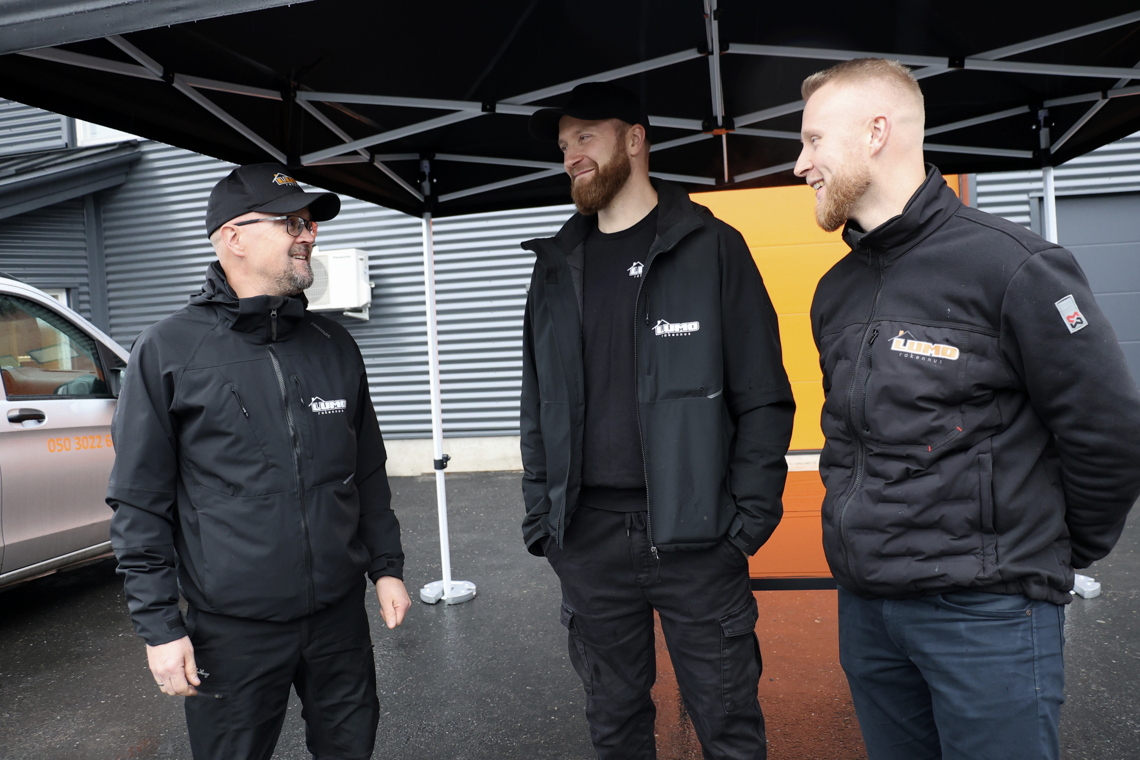 - Jaakko Jaara (vas.), Olli-Pekka Luokkanen ja Matias Luokkanen vastaanottivat kävijöitä Lumo Rakennuksen pihalla. Vaikka syksyinen sää ei suosinut, riitti tutustujia silti mukavasti päivän aikana.