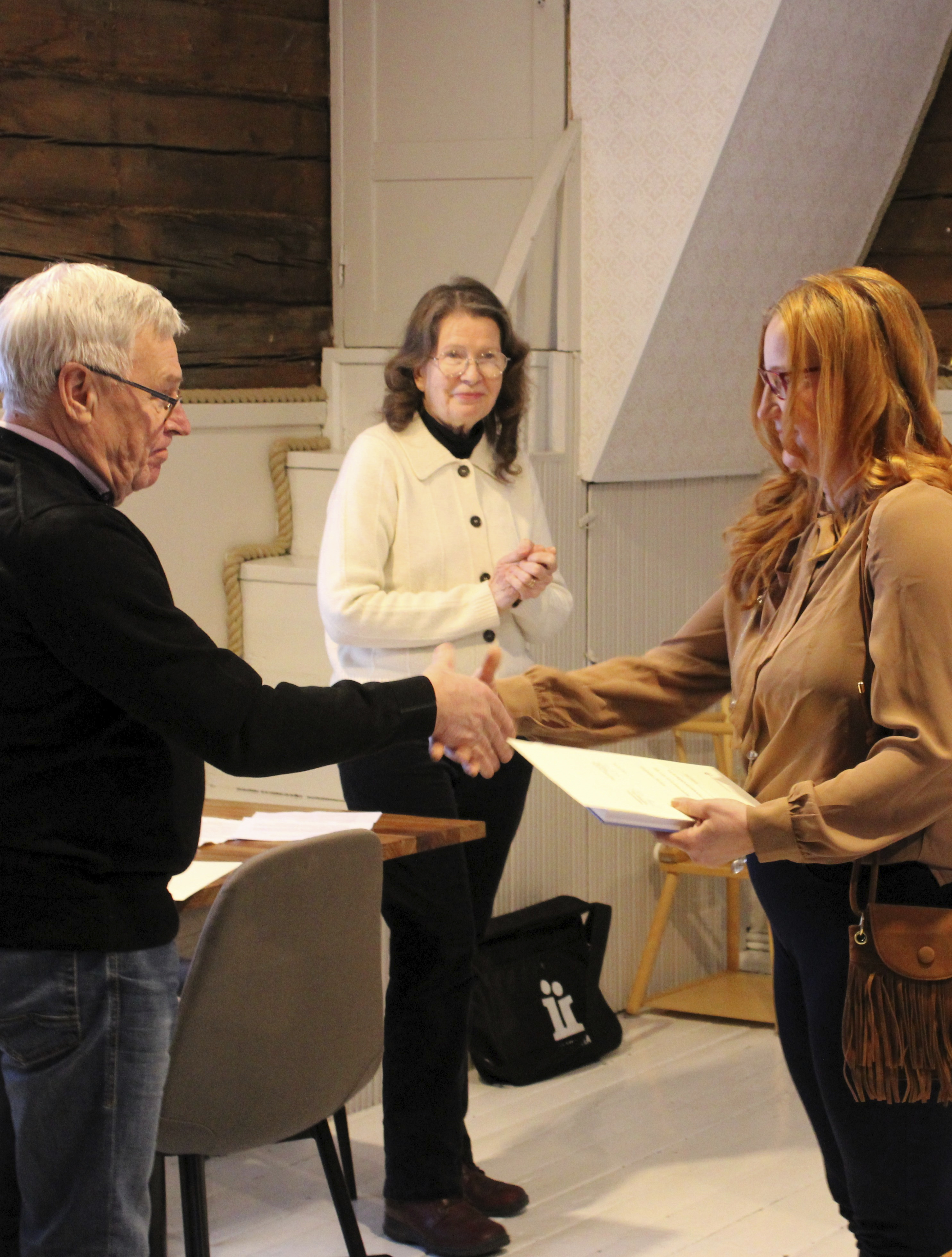 - Apurahat jakoivat säätiön hallituksen puheenjohtaja Olli Tolonen ja taideasiantuntija Kaija Elo, joka on säätiön hallituksessa ollut mukana sen perustamisesta eli vuodesta 1988 saakka. Apurahaansa vastaanottamassa Terhi Hanhela.