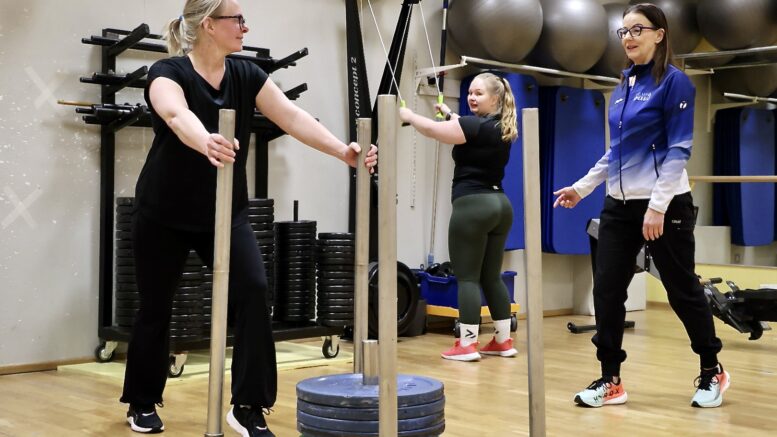 Kirsi Maasalmi (vasemmalla ) ja Heidi Karhumaa tutustuvat Päivi Mikkosen johdolla Hyroxiin. Kuva: Teea Tunturi