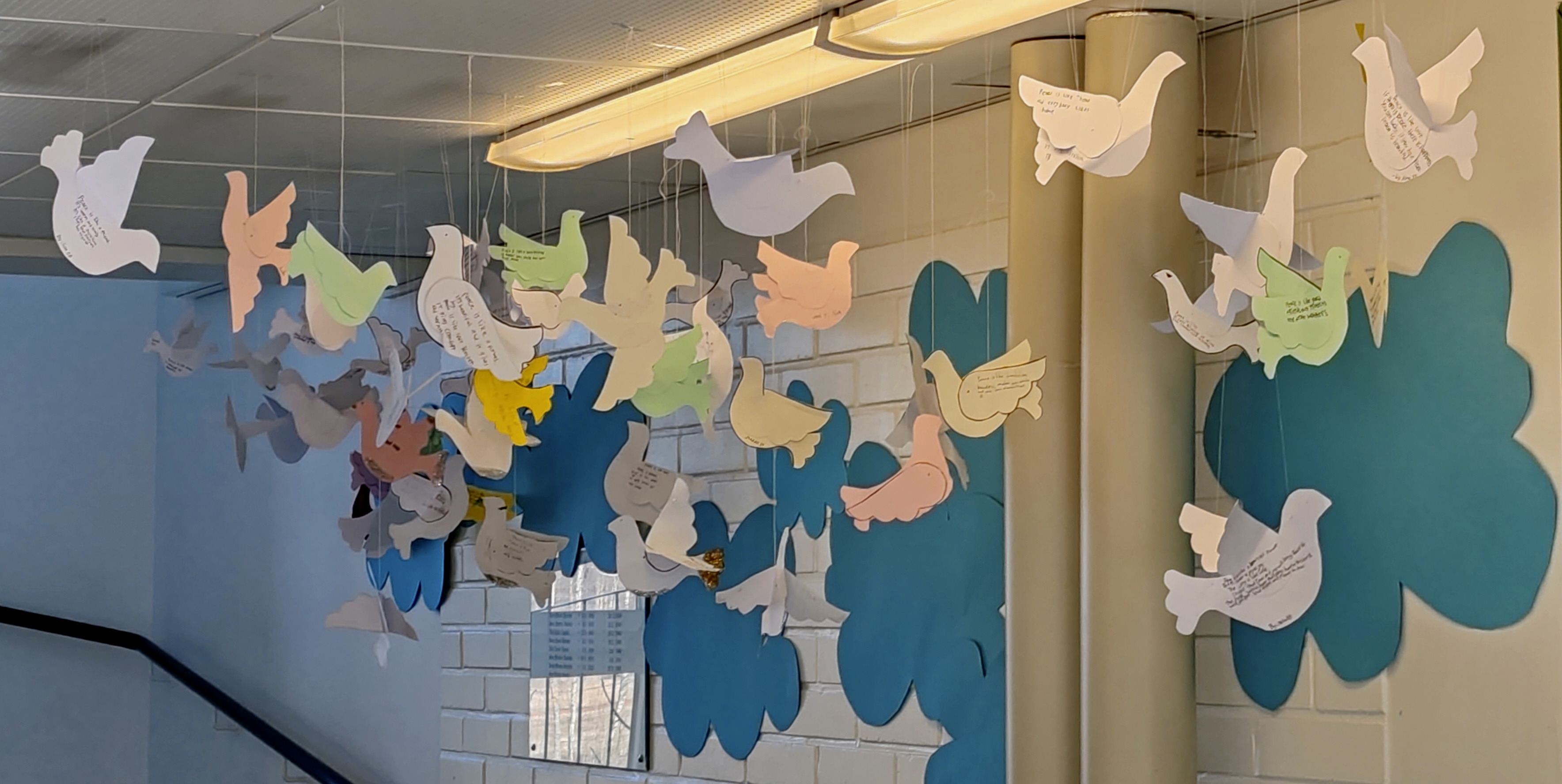 - Rauhankyyhkyt lentelevät nyt Kiiminkijoen koulun aulassa.