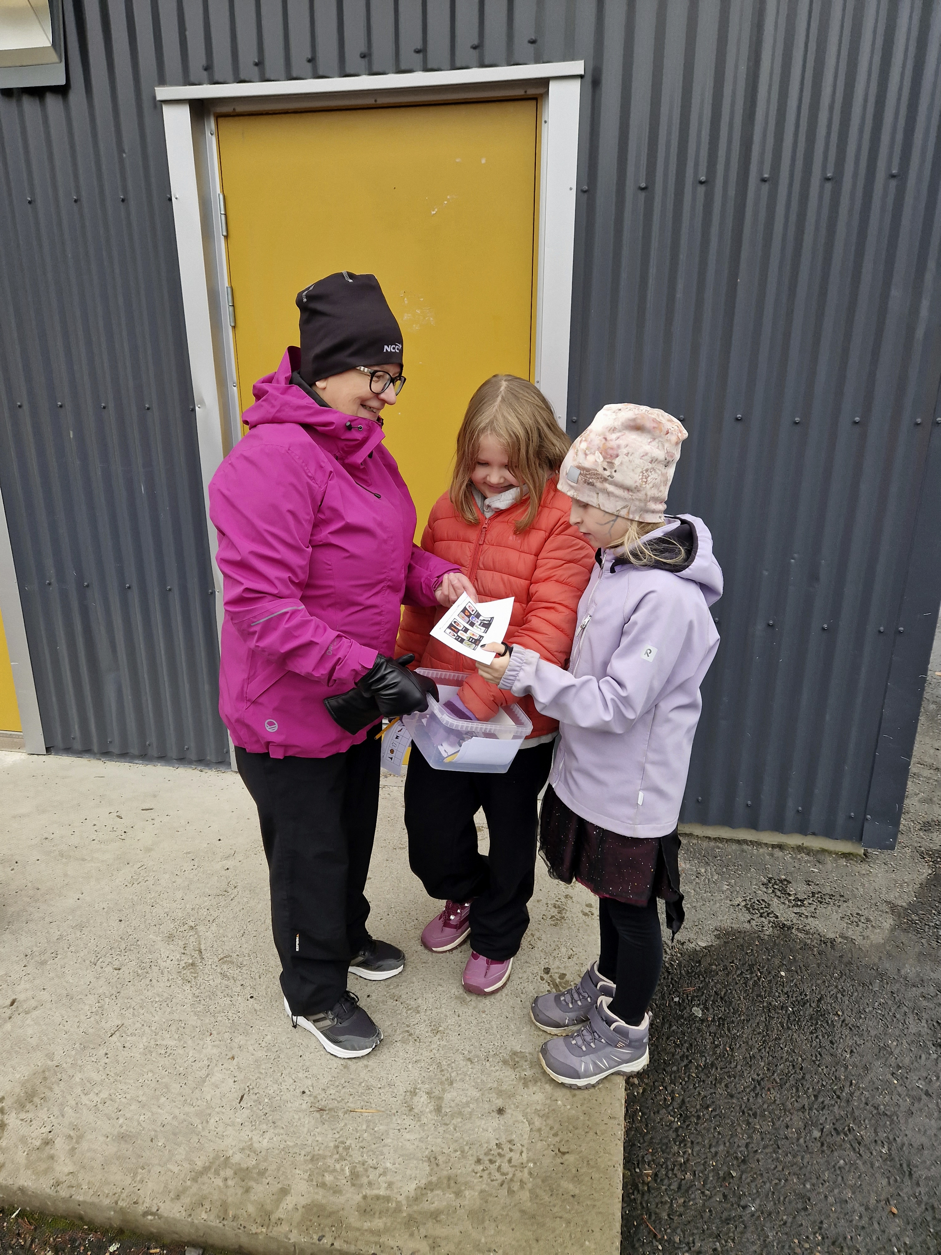 - Opettaja Mari Perätalo jakamassa Mila Pirille ja Iiris Keskimäiselle Halloween-radan lappuja.