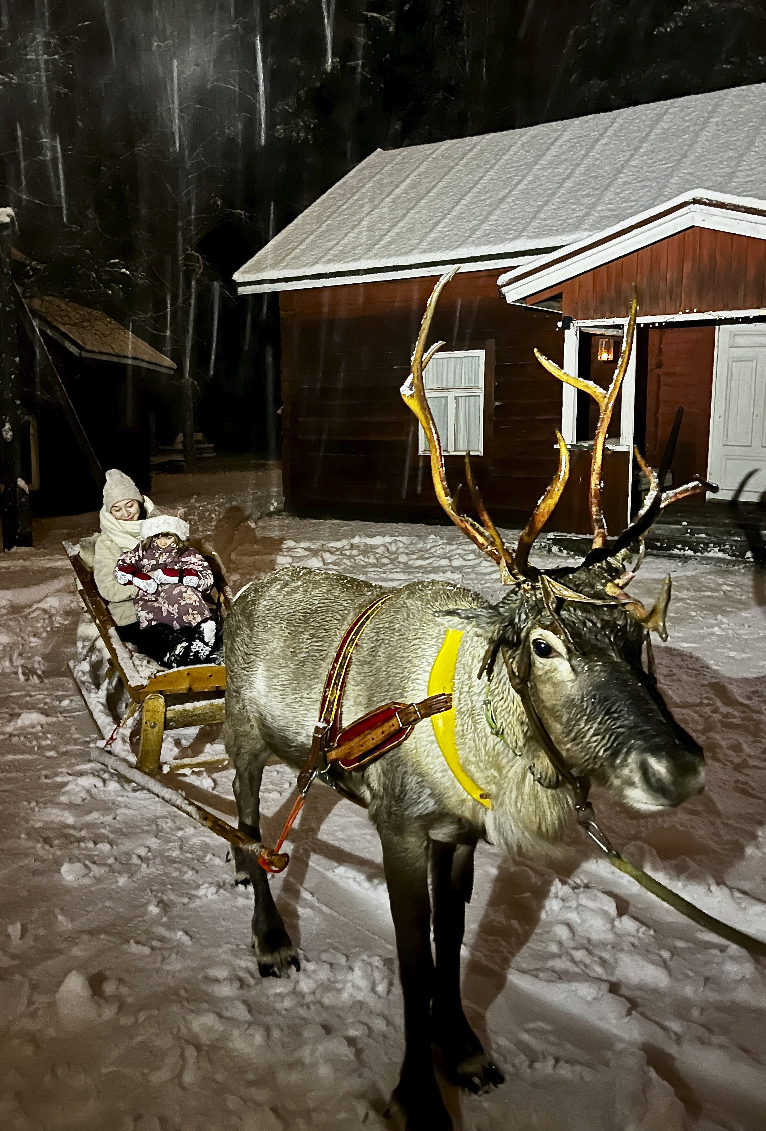 - Aurora Leipivaara pääsi äitinsä kanssa Uuno-poron kyydille museon pihamalla.