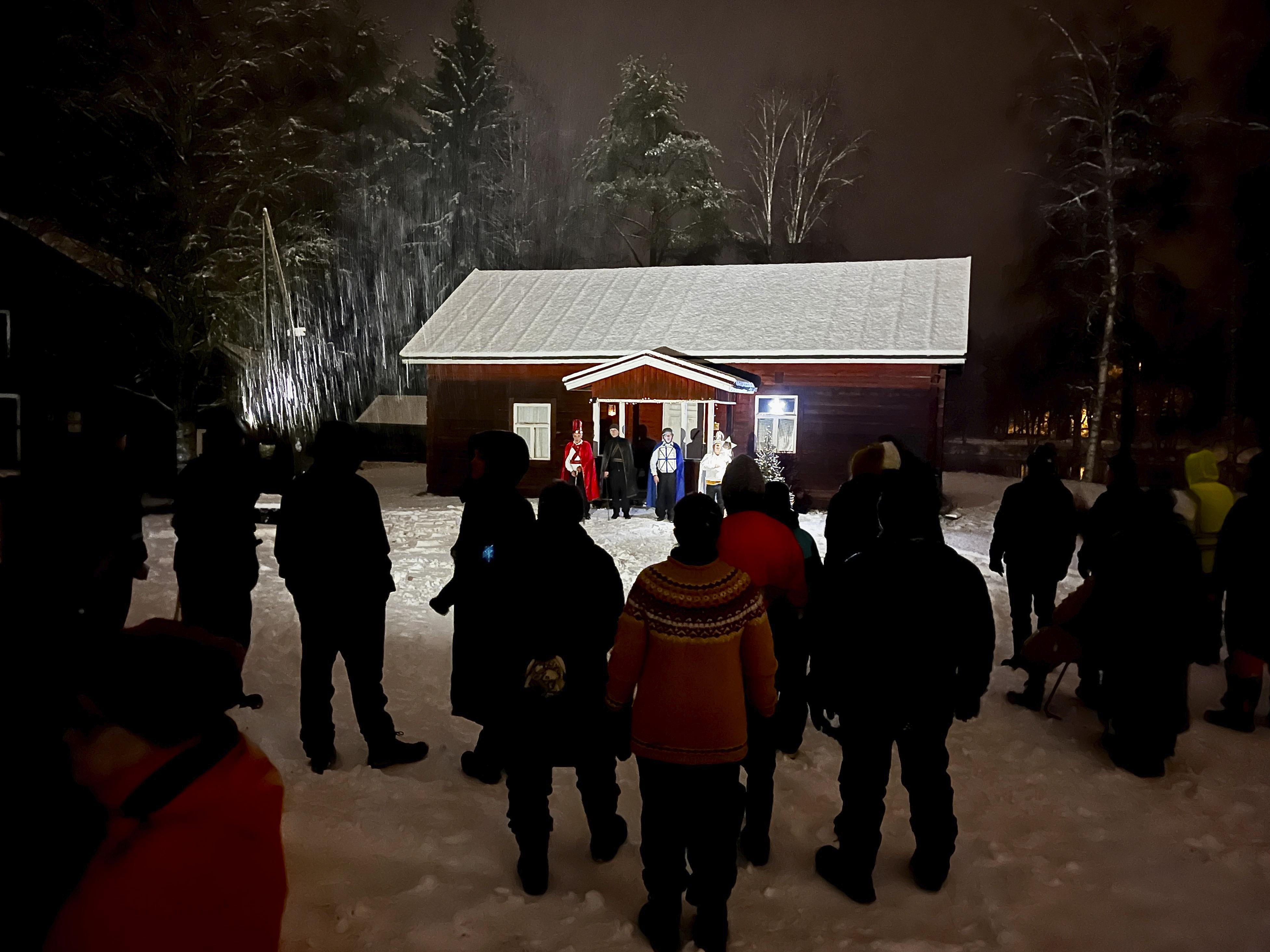 Museolla nähtiin upea mieslaulajien tiernapoika-esitys, jonka jälkeen joulupukki muoreineen karautti paikalle poron kyydillä. Varsin kosteissa olosuhteissa nautittiin lämmintä glögiä, pipareita ja joulumuorin tarjoamia karamelleja.